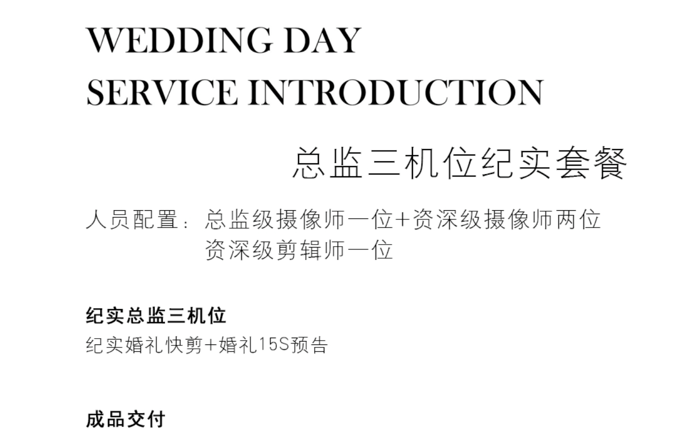 「Magic出品」总监三机位纪实套餐 人员配置:总监级摄像师1位+资深级摄像师2位 资深级剪辑师1位 成品交付:1.纪实婚礼快剪视频(当日交付) 2.婚礼15s预告片(当日交付) 3.婚礼全流程精剪长片 #婚礼完成后30天内,以百度网盘的形式交付婚礼视频长片#